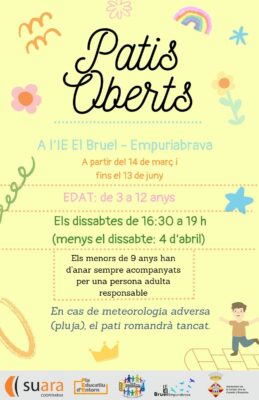 D’altra banda, el pati de l’IE El Bruel d’Empuriabrava estarà obert del 14 de març al 13 de juny, els dissabtes de 16.30 a 19 h, per a infants de 3 a 12 anys. Els menors de 9 anys també hauran d’anar acompanyats d’una persona adulta. En aquest espai no hi haurà activitat el 4 d’abril.