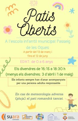 El pati de l’Escola Infantil Municipal Passeig de les Oques s’obrirà del 13 de març al 12 de juny, els divendres de 16.15 a 18.30 h, adreçat a infants de 0 a 6 anys. En aquest cas, els infants hauran d’anar sempre acompanyats d’una persona adulta responsable. El servei no es realitzarà els dies 3 d’abril i 1 de maig.